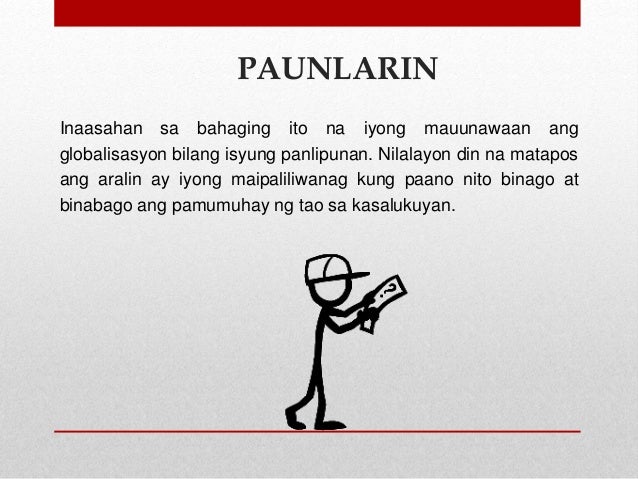 EDWIN PLANAS ADA Teacher I Dasmarias West NHS ARALIN IGLOBALISASYON Konsepto at Perspektibo Panimula at mga Gabay na Tanong Sa modyul na ito ay susuriin ang mga isyung pang-ekonomiya tulad ng globalisasyon isyu sa paggawa at. Bilang kabataan paano mo babaguhin ang iyong sarili upang maiwasan na ang mga suliraning panlipunan o sa sariling lugar na katulad ng suliraning inilahad sa aralin.