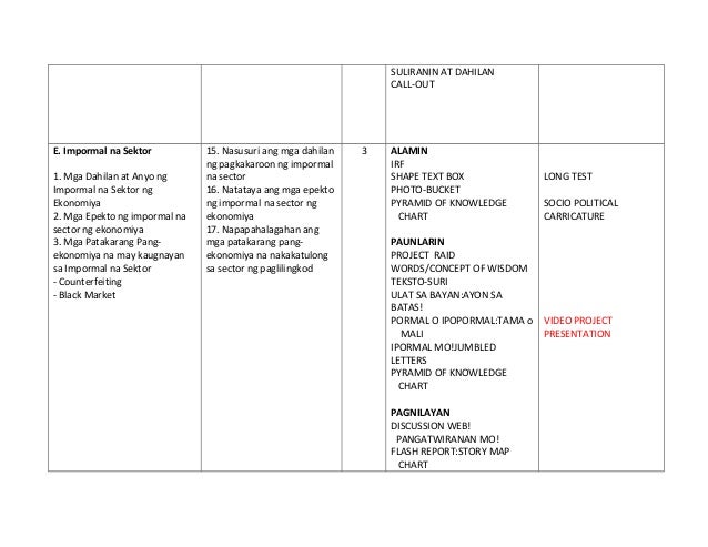 Paglilingkod at mga patakarang pang- ekonomiyang nakatutulong dito Week 89 4th Q Nabibigyang-halaga ang mga ang mga gampanin ng impormal na sektor at mga patakarang pang- ekonomiyang nakatutulong dito Week 10 Nasusuri ang pang-ekonomikong ugnayan at patakarang panlabas na nakakatulong sa Pilipinas. Kakulangan sa makabagong kagamitan at teknolohiya. M0dyul 2 Mga Isyung Pang Ekonomiya Aralin 1 Glabalisasyon Konsepto.