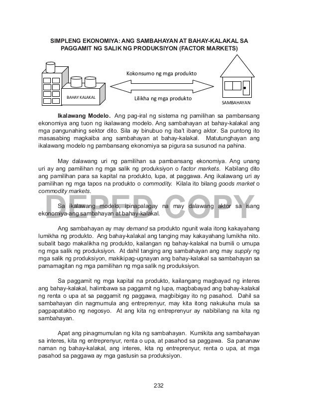 Kailangan din na may sapat na dami ng bahay- kalakal na handang mamuhunan. Nagbebenta ang sambahayan ng mga salik ng produksiyon input lupa kapital paggawa entreprenyur Bumibili ang bahay-kalakal ng mga salik ng produksiyon input lupa kapital paggawa entreprenyur Pamilihan ng mga Kalakal at Paglilingkod. Tumatanggap ito ng kita galing sa bahay kalakal bilang kabayaran sa itinustos nilang salik ng produksyon 2.