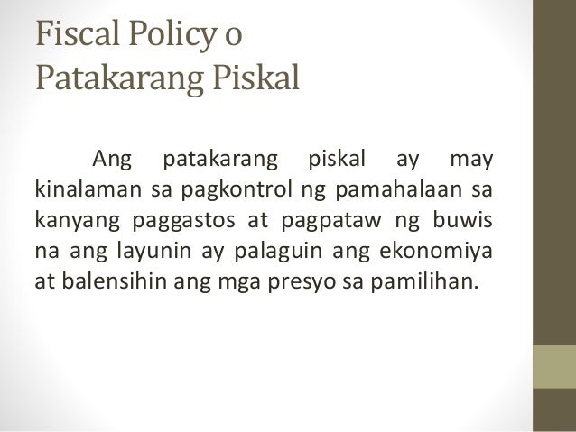 Dapat nating bigyang halaga ang ating sariling wika lalo na sa paggamit nito sa ibat ibang sektor ng lipunan gaya nalang ng ating ekonomiya. Patakarang piskal -- ay pagkontrol ng pamahalaan sa ekonomiya sa pamamagitan ng pagbubuwis at paggastos upang matamo ang maayos na daloy ng. Mataas ang presyo ng bigas na inaani sa bansa C.